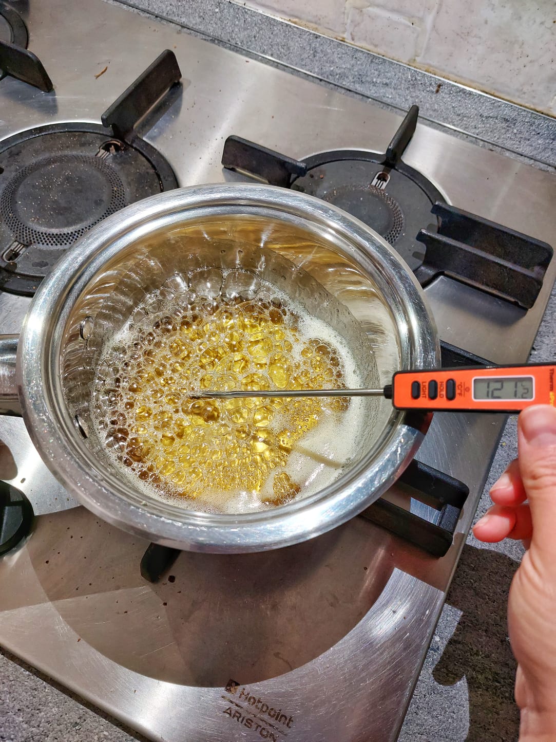 Montare i tuorli in planetaria, nel frattempo versare il miele in un pentolino e scaldarlo fino alla temperatura di 121 gradi.