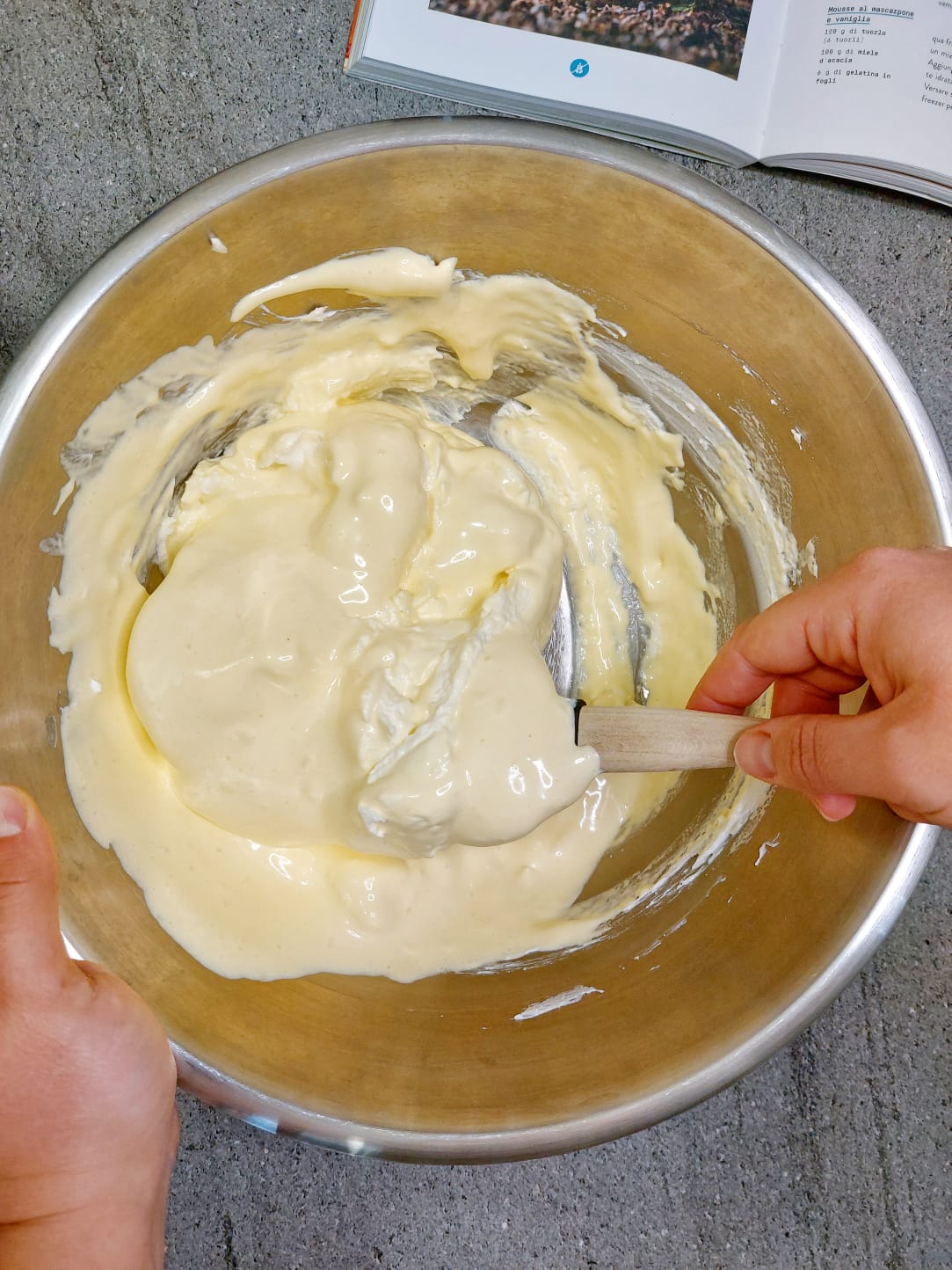 Amalgamare il mascarpone insieme alla panna liquida, una volta ottenuto un composto liscio aggiungere in tre step il composto di tuorli e miele (pate a bombe).