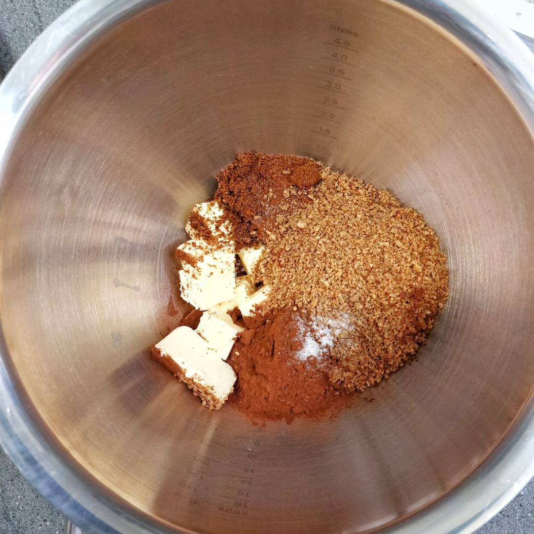 Unire tutti gli ingredienti in una planetaria e impastare rapidamente fino a ottenere un composto sabbioso. Cuocere in forno ventilato a 165 gradi per 18 minuti. Far raffreddare completamente.