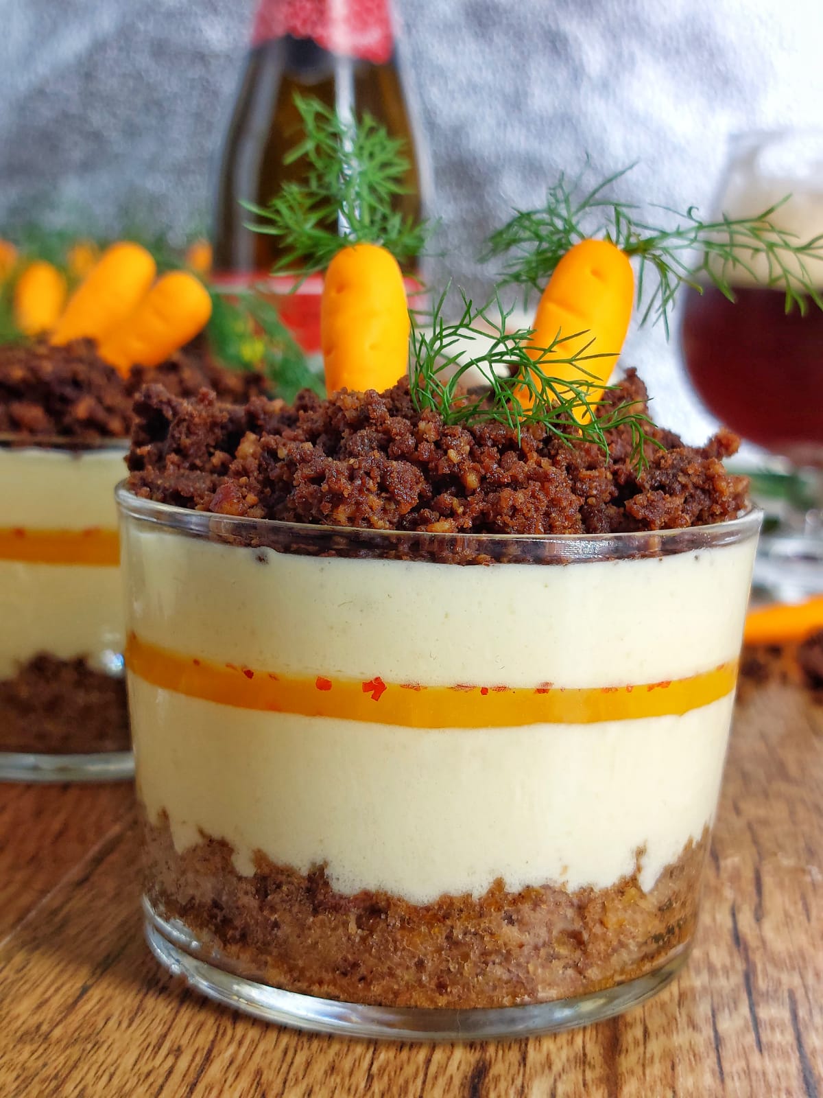 Finire il dolce con il crumble e decorare con le carote in pasta di zucchero.