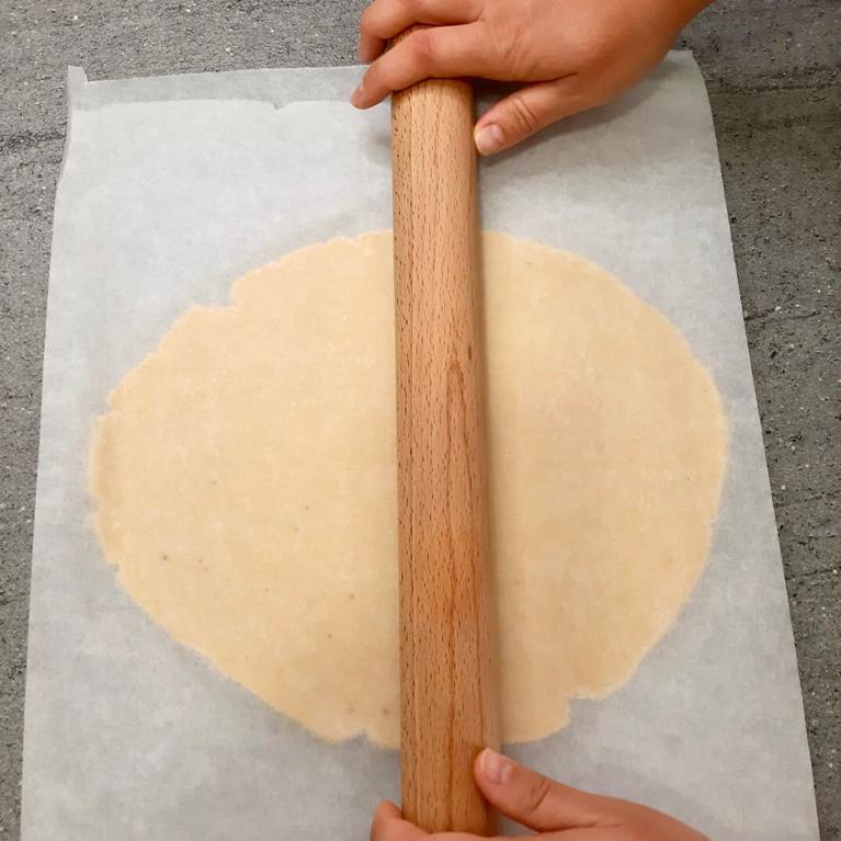 Tirare fuori dal frigo la pasta frolla salata e stenderla tra due fogli di carta forno dello spessore di 0,4 cm copparla creando dei dischetti di 7,5 cm di diametro.