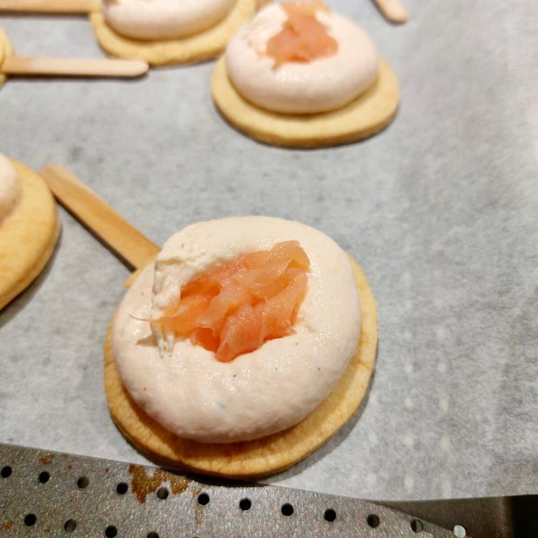 Con l’aiuto di una sac a poche creare un anello di crema di salmone su 7 dischi di frolla, inserire al centro un pezzetto di salmone affumicato e coprire con un altro dischetto.
