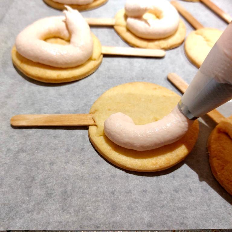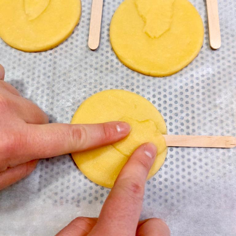 Su 7 dischi poggiare lo stecchino di legno ricoprendolo con un pezzetto di pasta frolla, premere delicatamente in modo da sigillare bene lo stecchino tra la frolla ma senza allargare il disco.