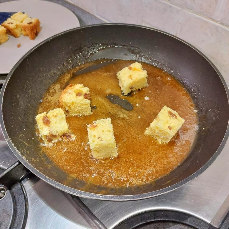 Passare rapidamente i cubetti di panettone nel caramello, ricoprendo tutti i lati. Poggiarli su un foglio di carta forno a raffreddare.