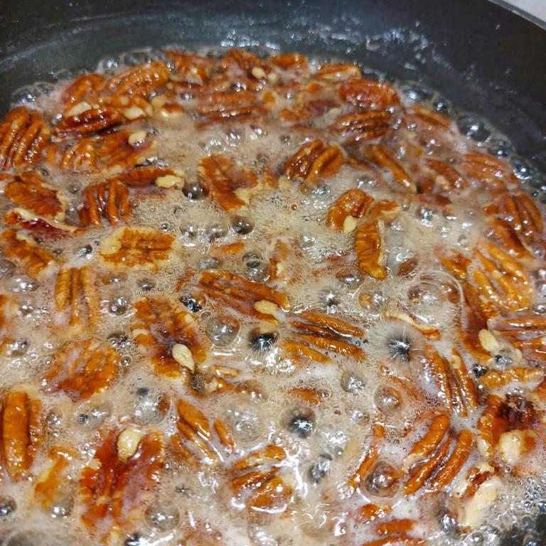 Per sabbiare le noci pecan inserire in una padella lo zucchero, le noci e l’acqua.