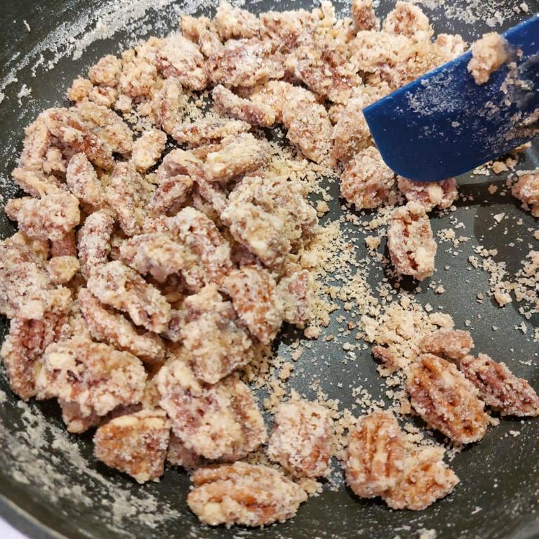 Tenendo la fiamma bassa far sciogliere lo zucchero. L’acqua inizierà ad evaporare facendo tornare allo stato solido lo zucchero che aderirà bene alle noci creando l’effetto sabbiato.