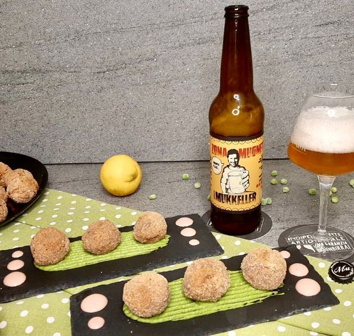 …polpette, perfette come aperitivo o come secondo piatto, accompagnate con la maionese fatta con l’acqua di cottura del polpo e una crema di piselli.